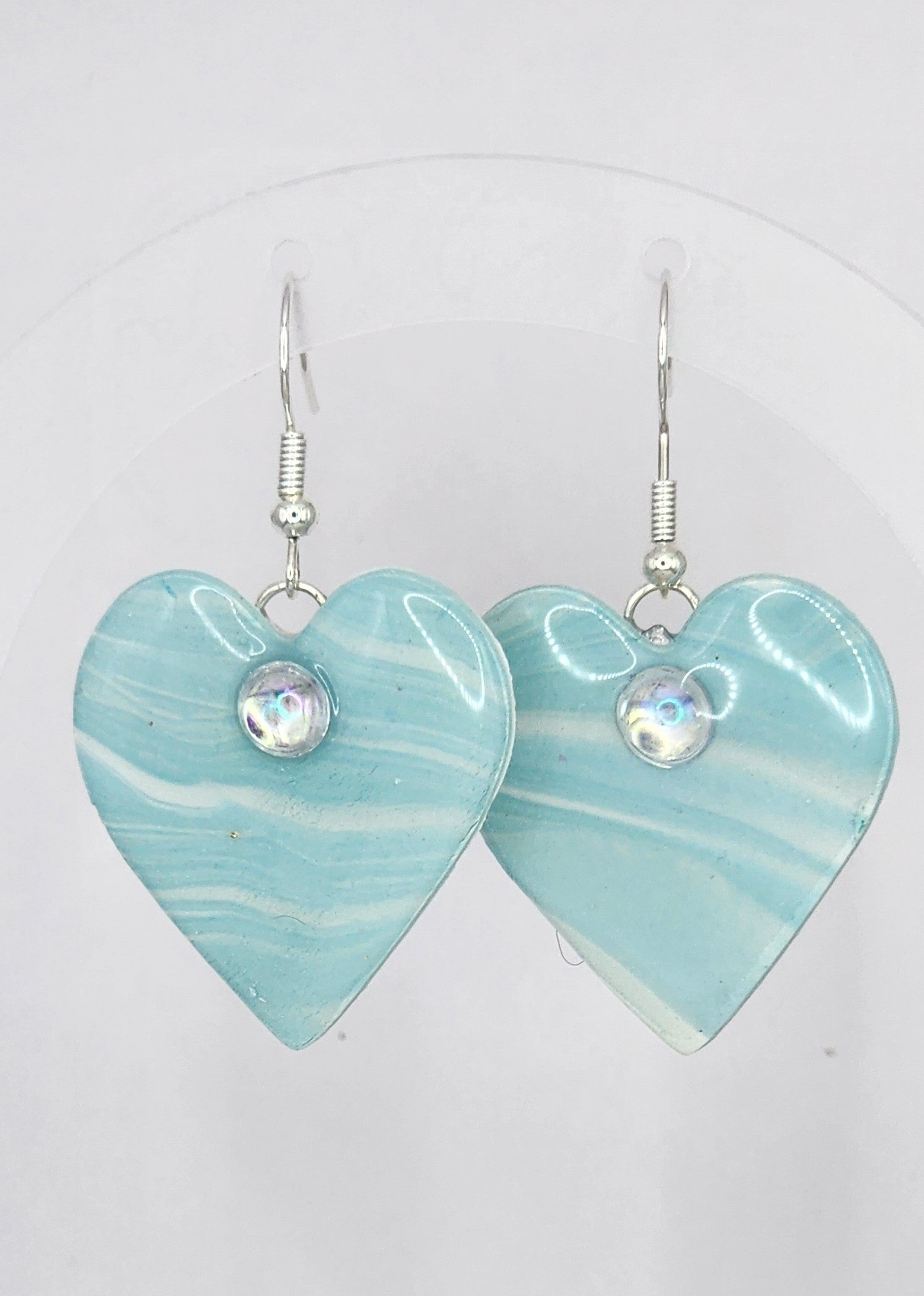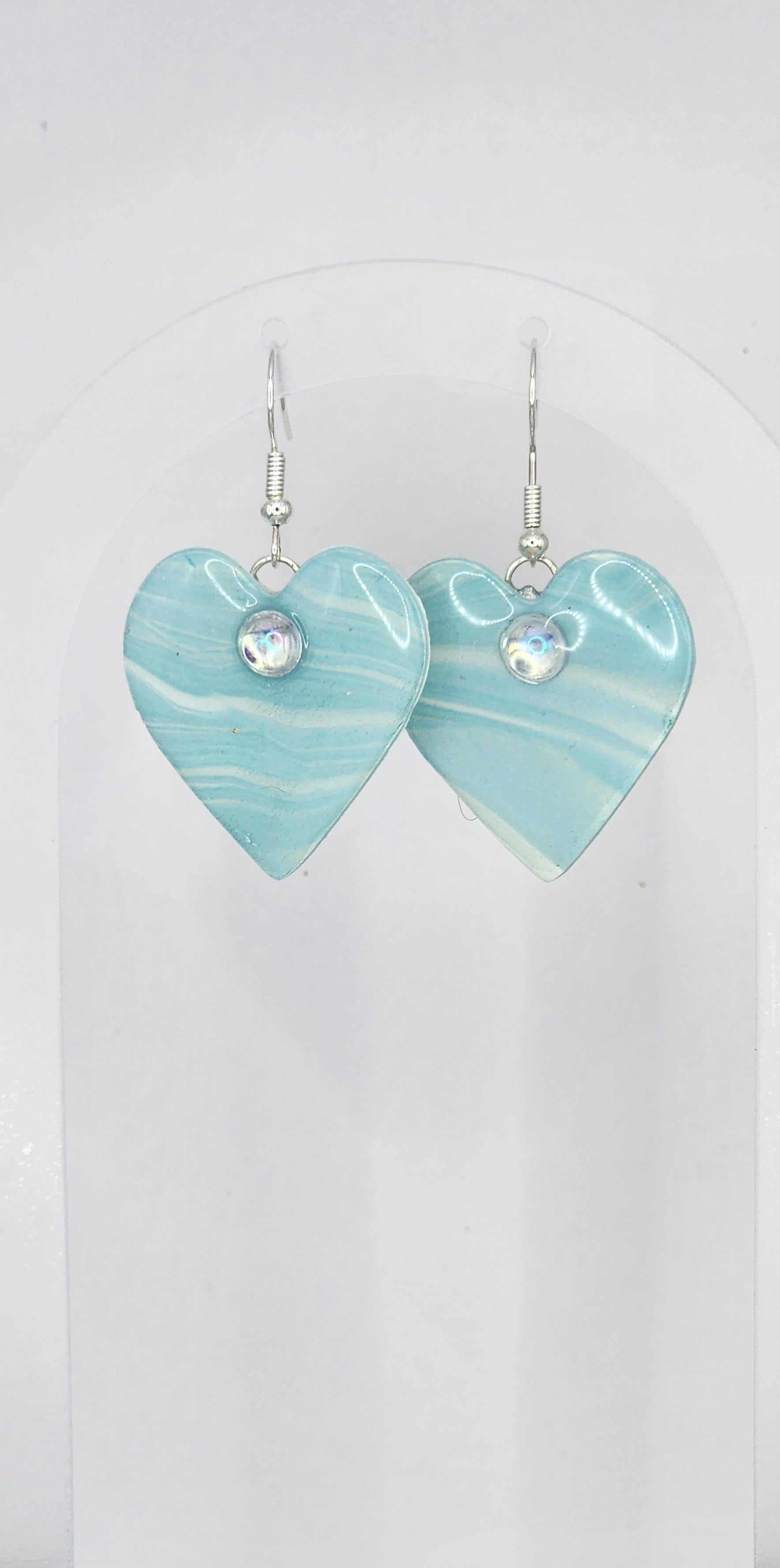 | Romantic meets oceanic in these heart-shaped earrings, swirling with cool tones of blue and soft marble patterns that echo the serenity of sea foam. A luminous iridescent bead rests at the center, catching the light like a sunlit ripple. Framed by sleek silver-tone hooks with a subtle coil accent, these handcrafted beauties bring a soft yet striking presence to any outfit. |