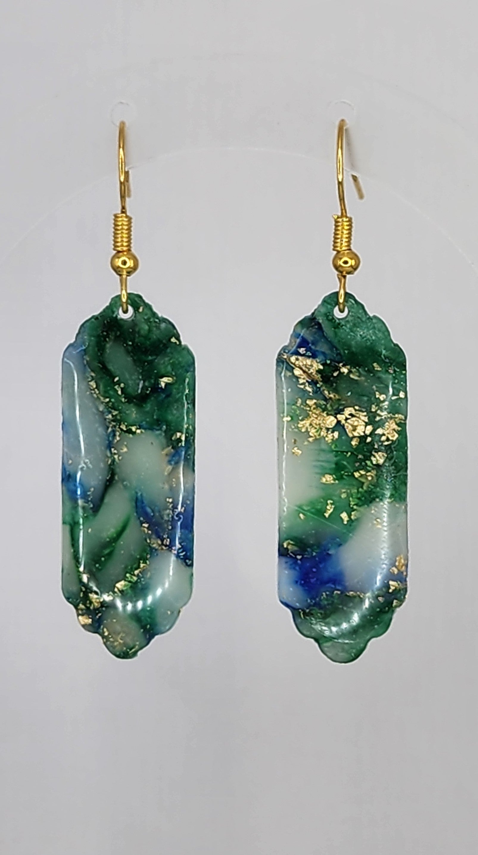 | Dive into tranquility with these elongated, scalloped-edge earrings, showcasing a dreamy swirl of seafoam green, ocean blue, and soft white. Accented with glimmers of gold flakes, each resin pendant captures the ethereal beauty of sunlight dancing on water. Finished with graceful gold-tone hooks, these lightweight earrings are a stunning blend of organic charm and modern artistry. |