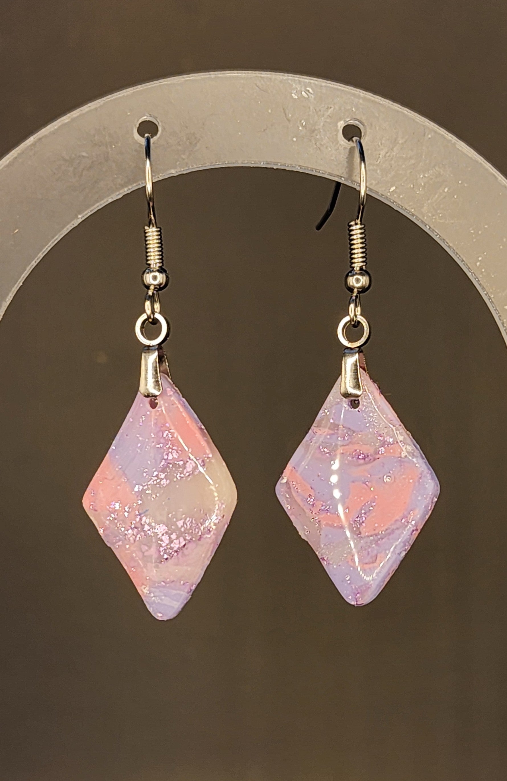 | Elevate your accessory game with these delicate diamond-shaped earrings, swirling in a mesmerizing pastel blend of pink and lavender tones. The resin finish shimmers with soft iridescence, like morning light dancing on flower petals. Suspended from sleek silver-tone hooks, their lightweight design offers comfort with a dash of elegance—perfect for adding a romantic touch to both casual and dressy looks. |