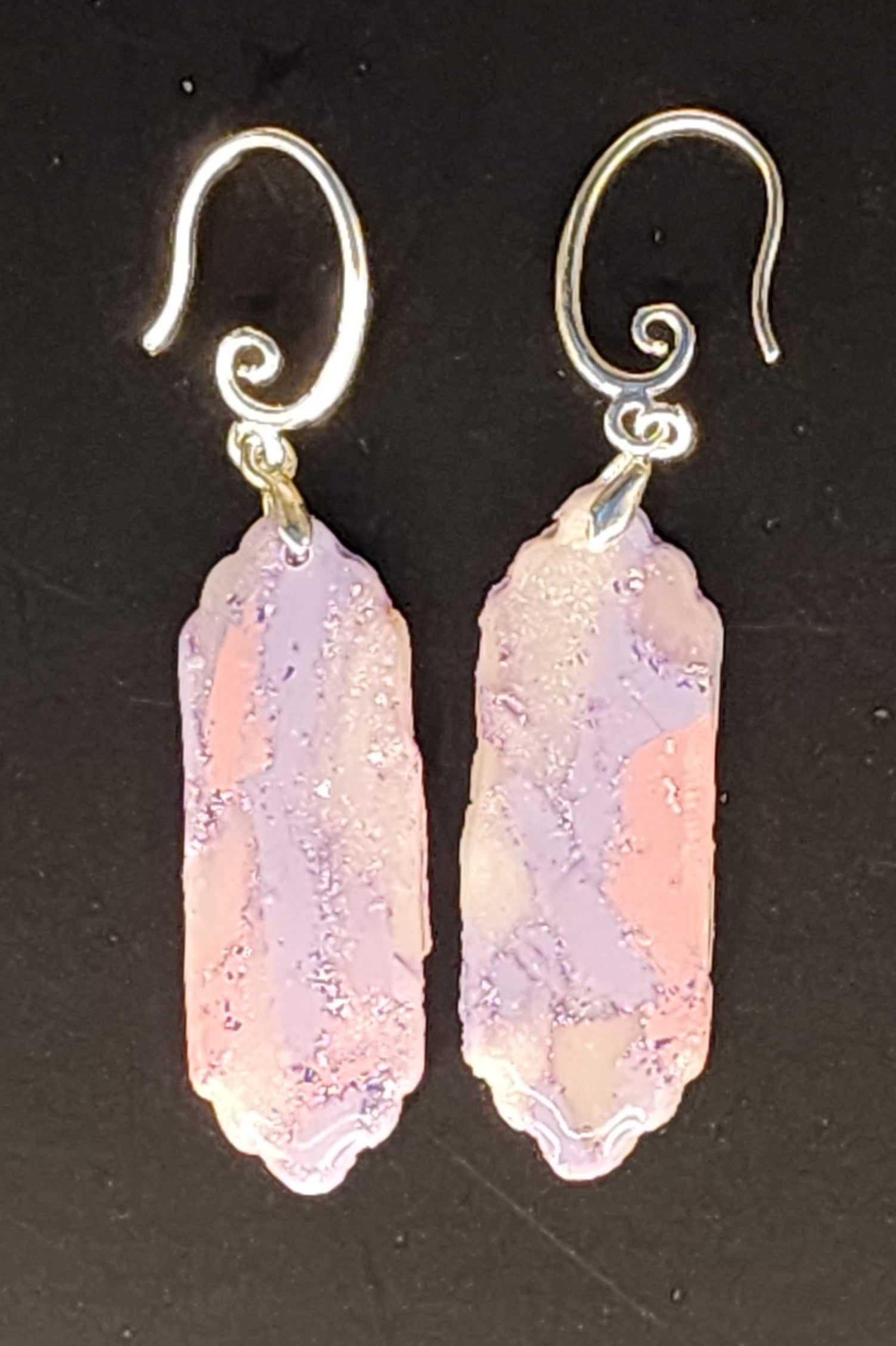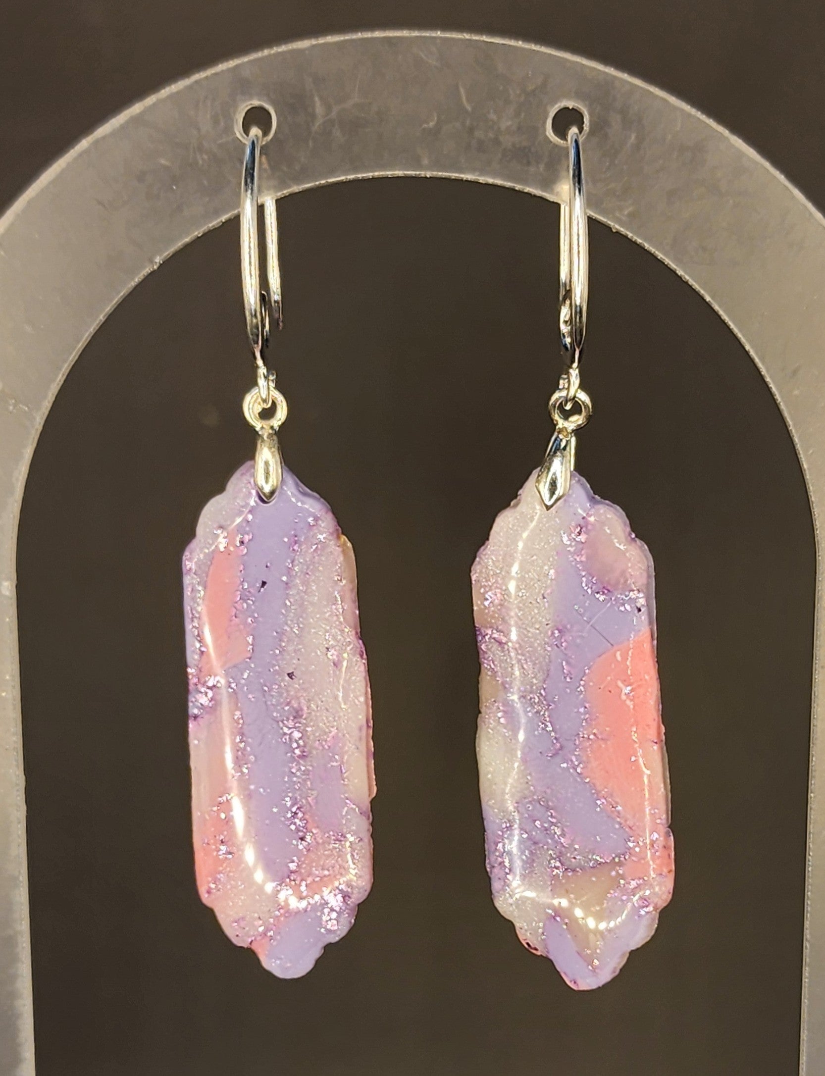 | Add a splash of whimsy to your wardrobe with these handcrafted pastel beauties. Dangling from elegant silver swirl hooks, each earring features a scalloped-edge rectangular pendant infused with soft shades of pink, lilac, and peach—like a watercolor daydream brought to life. The textured finish gives it a handcrafted feel, while the lightweight design ensures comfort from morning lattes to moonlit strolls. |